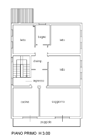 L'abitazione si compone di: ingresso, cucina abitabile, soggiorno con affaccio sul poggiolo, disimpegno, bagno e tre camere da letto di generose dimensioni.