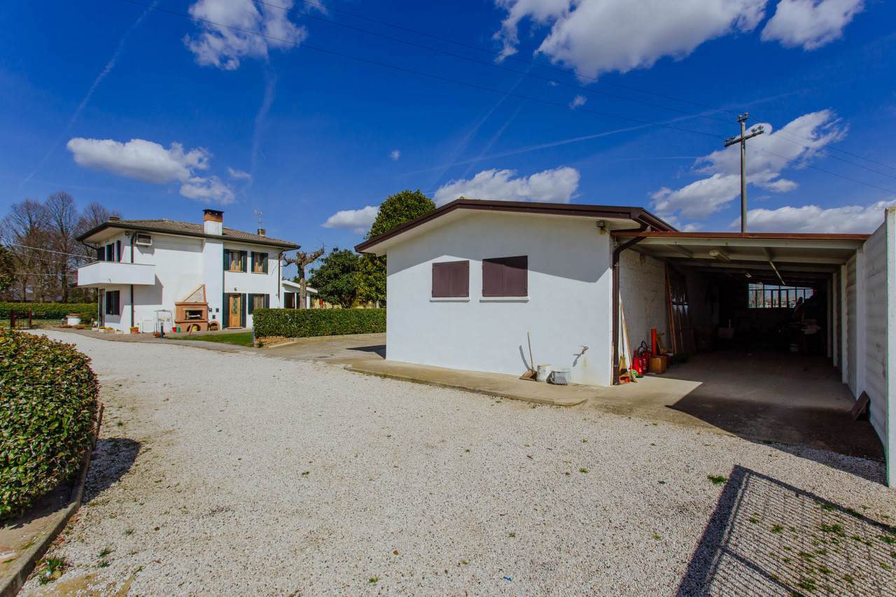 L'abitazione è esternamente attrezzata con patio piastrellato e caminetto, spazio ideale per pranzi o cene immersi nella tranquillità del verde. Il giardino è davvero spazioso e ben tenuto con possibilità di parcheggio sia coperto che scoperto per diversi veicoli.
